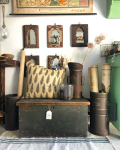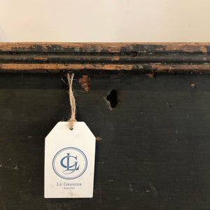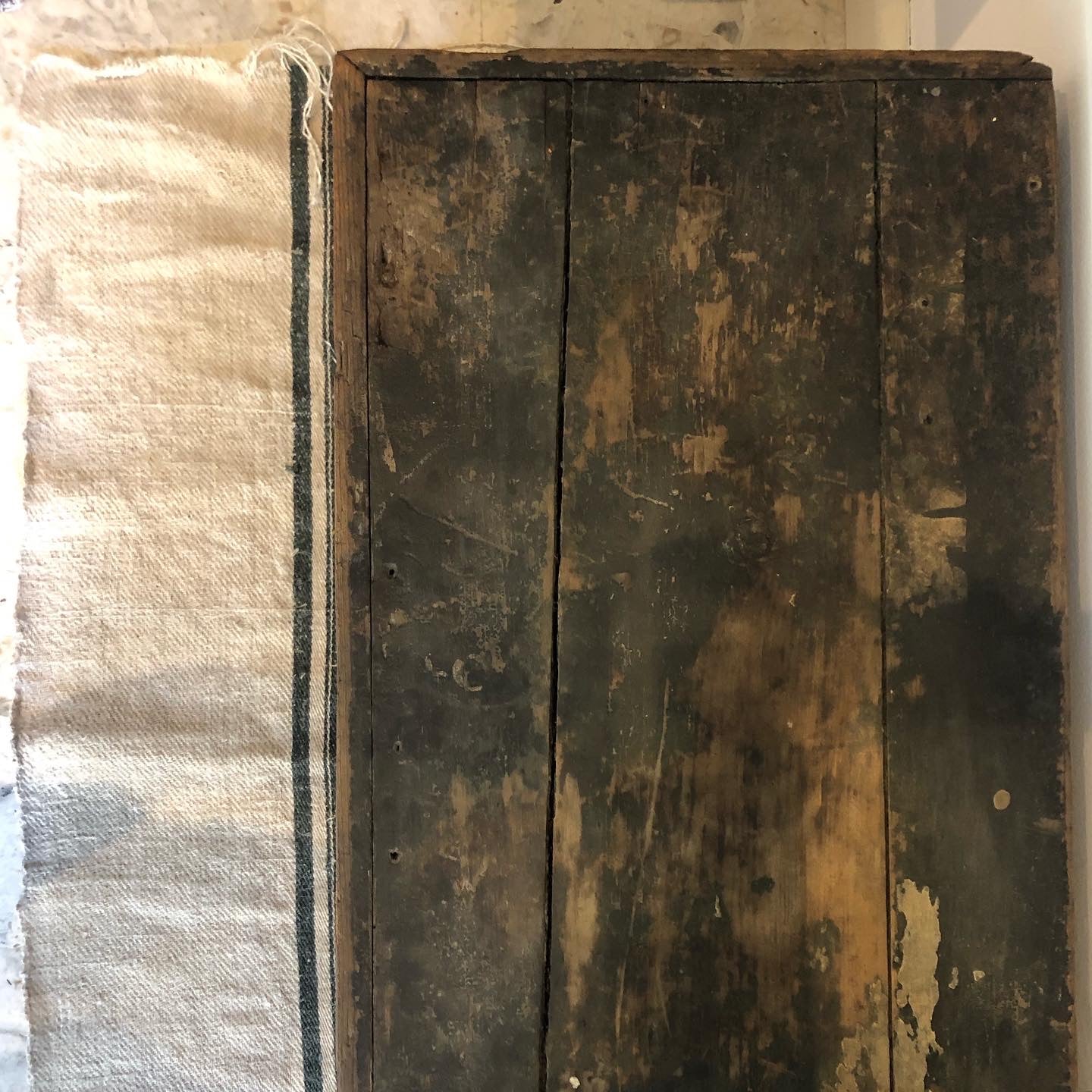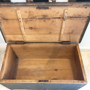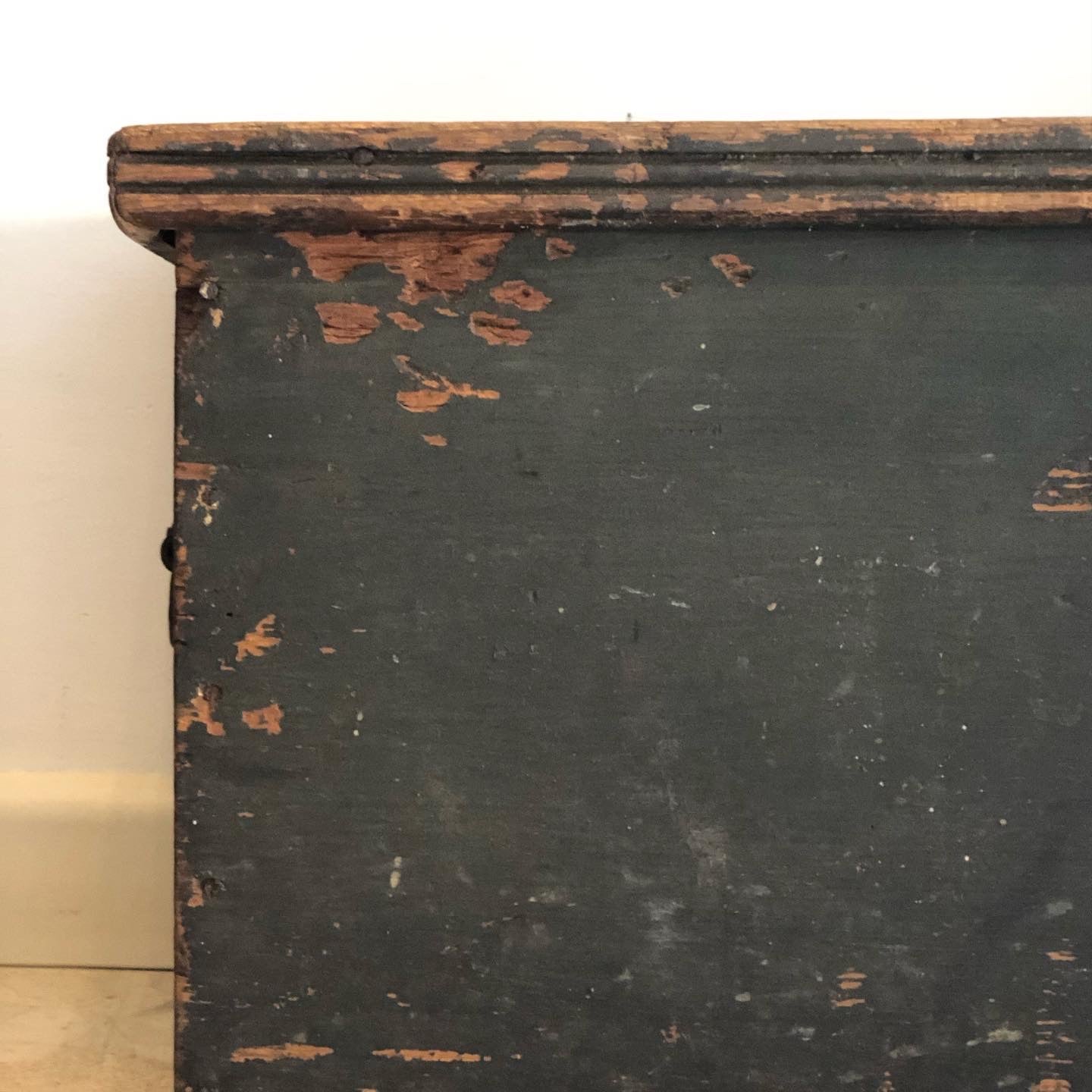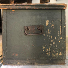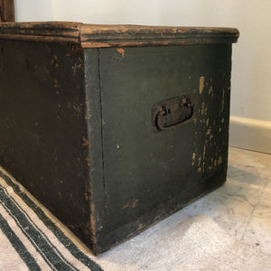 Cassapanca / baule in legno con coperchio. Recuperato in Abruzzo, prima metà del ‘900. Laccatura verde militare originale, con evidenti segni del tempo e di utilizzo. maniglie laterali in ferro