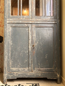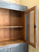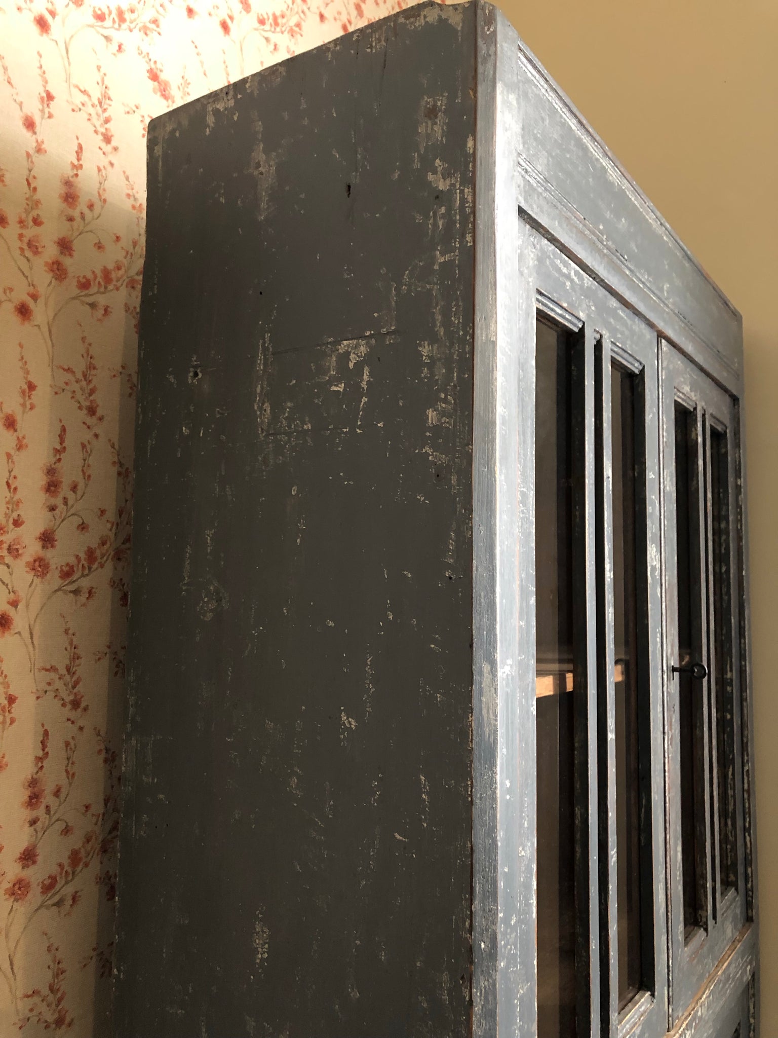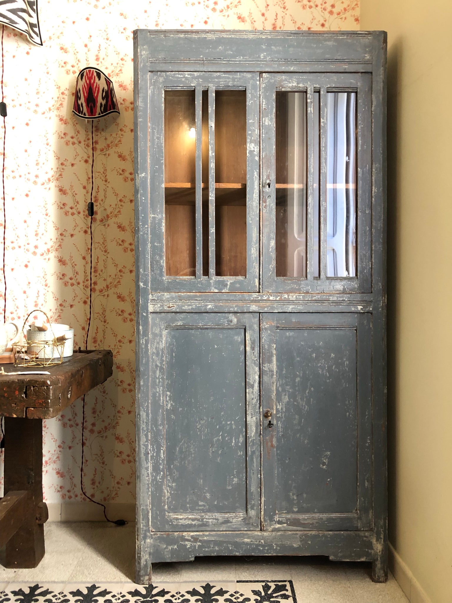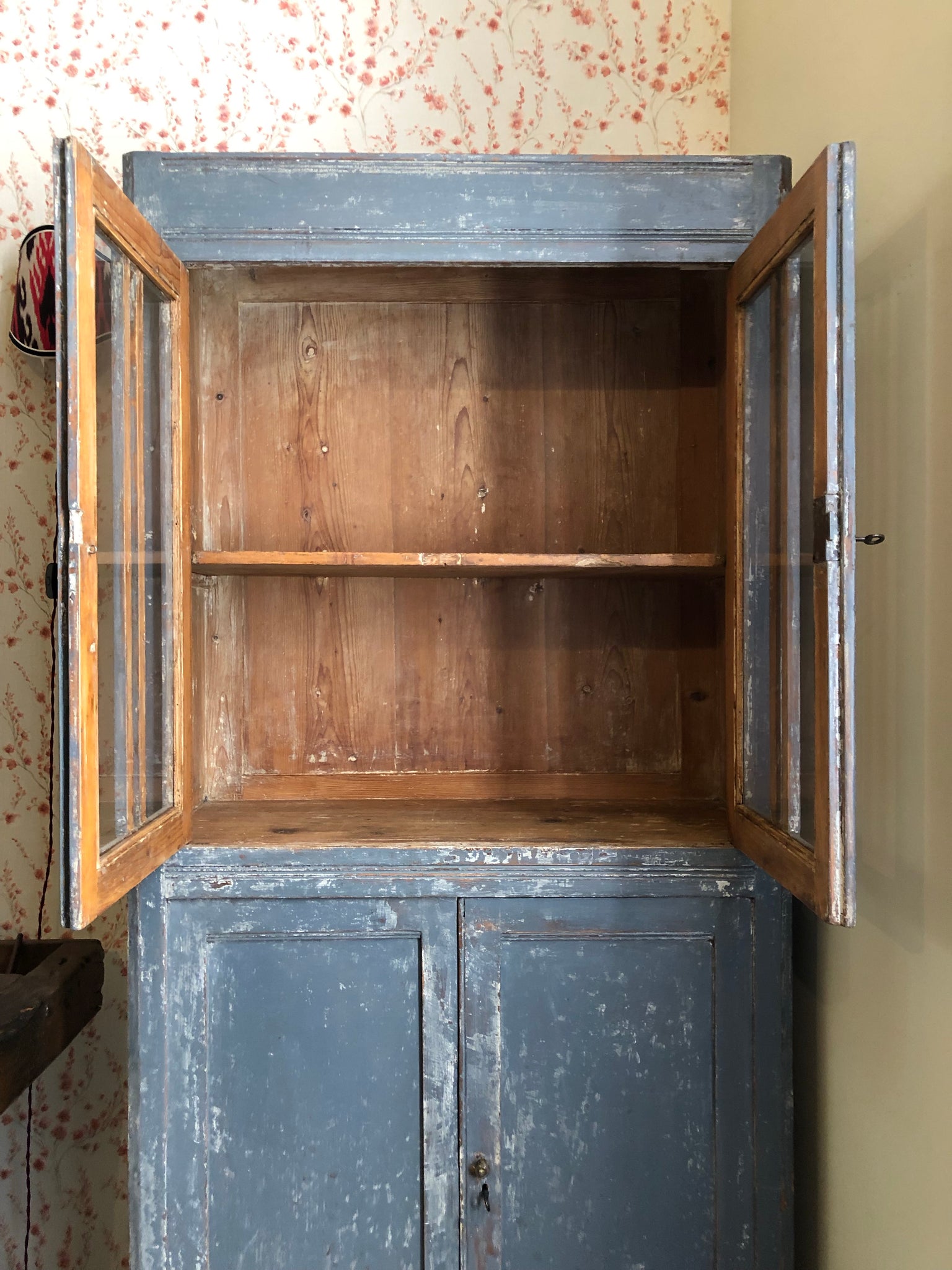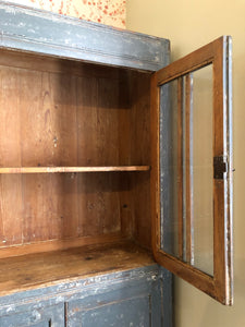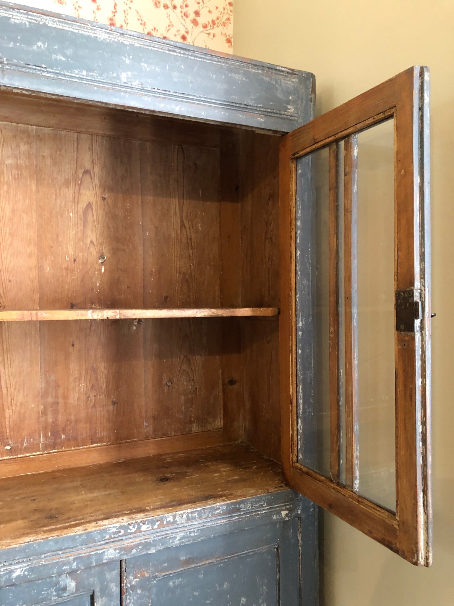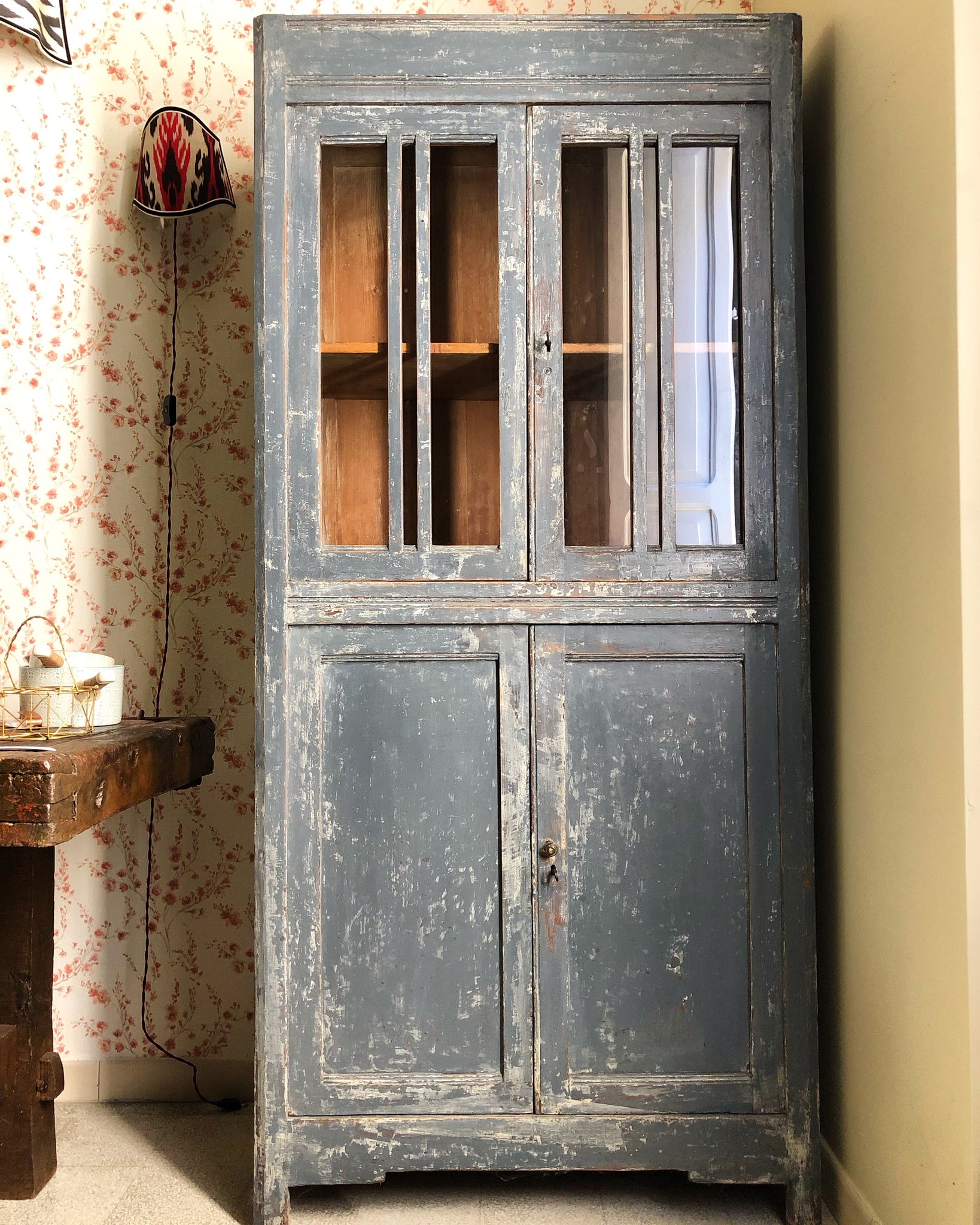 Sideboard in fir with two doors and two doors with glass, original lacquering, back in solid wood. Italy, Marche, about 1920. Conservative restoration and recovery. It has slight signs of aging and imperfections that confirm its craftsmanship.