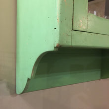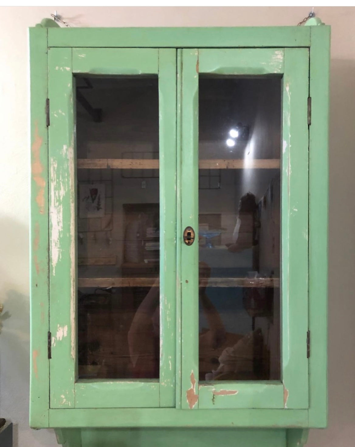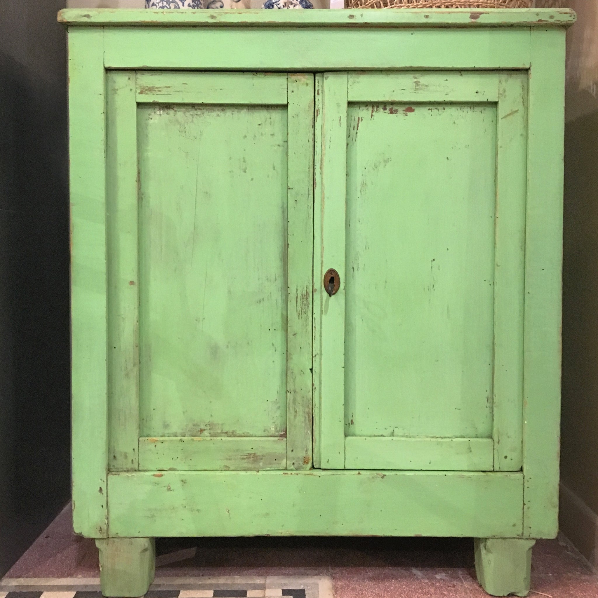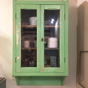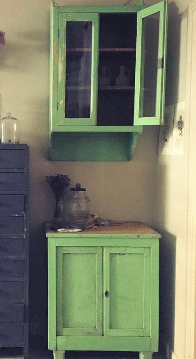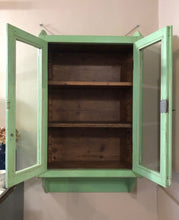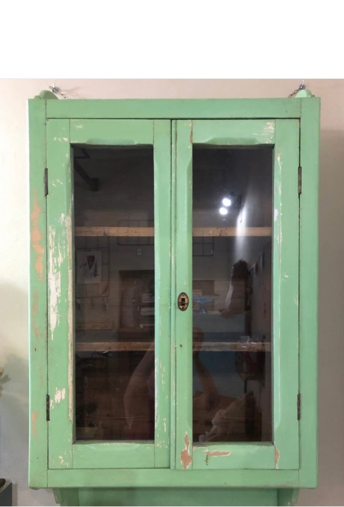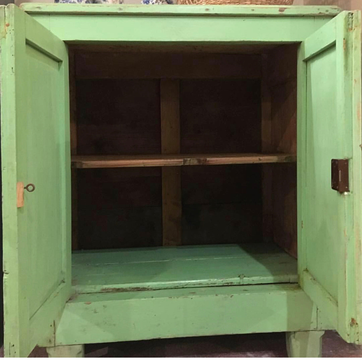 Sideboard and glass cabinet with two doors in fir and poplar wood. Origin: Italy, Marche, around 1930. Handcrafted, restored, original light green lacquer. Consisting of two separate pieces of furniture, display cabinet with 2 adjustable shelves, sideboard 1 shelf.