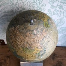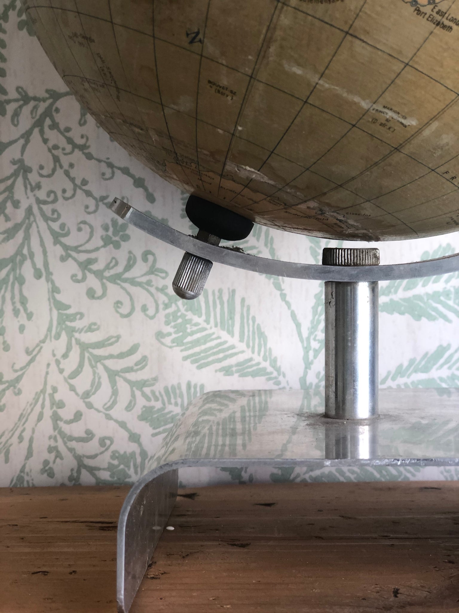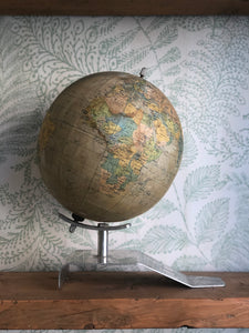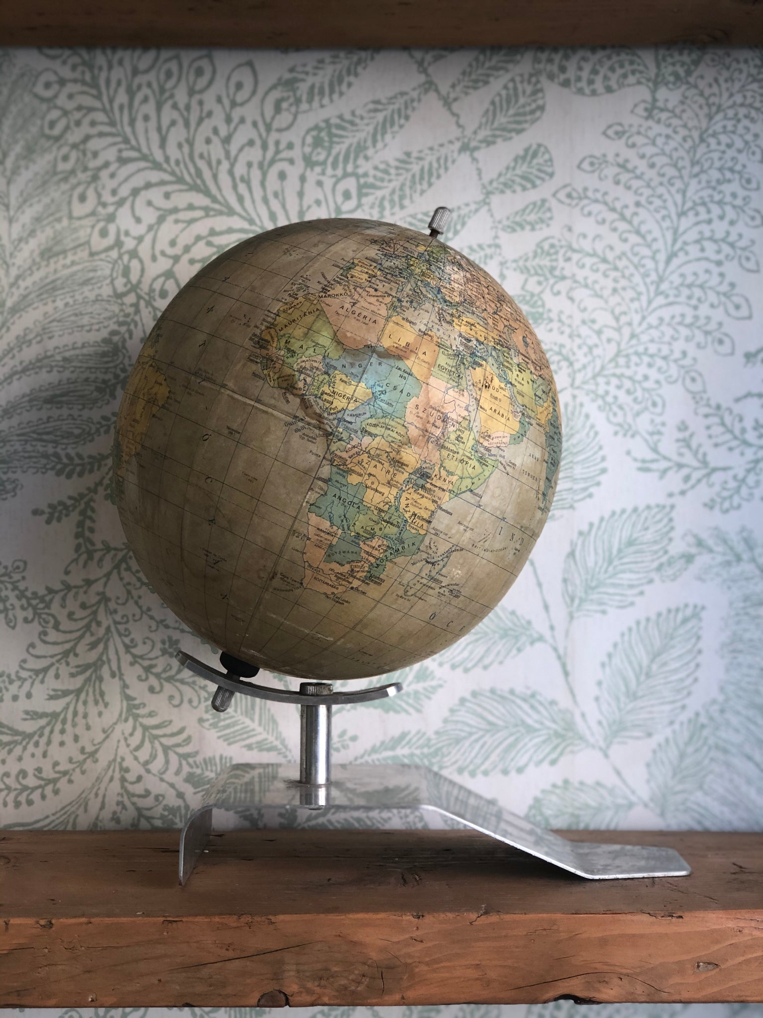 Vintage paper covered globe, metal base. Europe, about 1960. Color: beige / multicolor