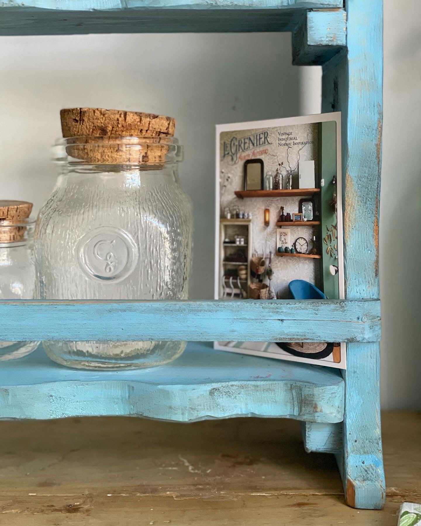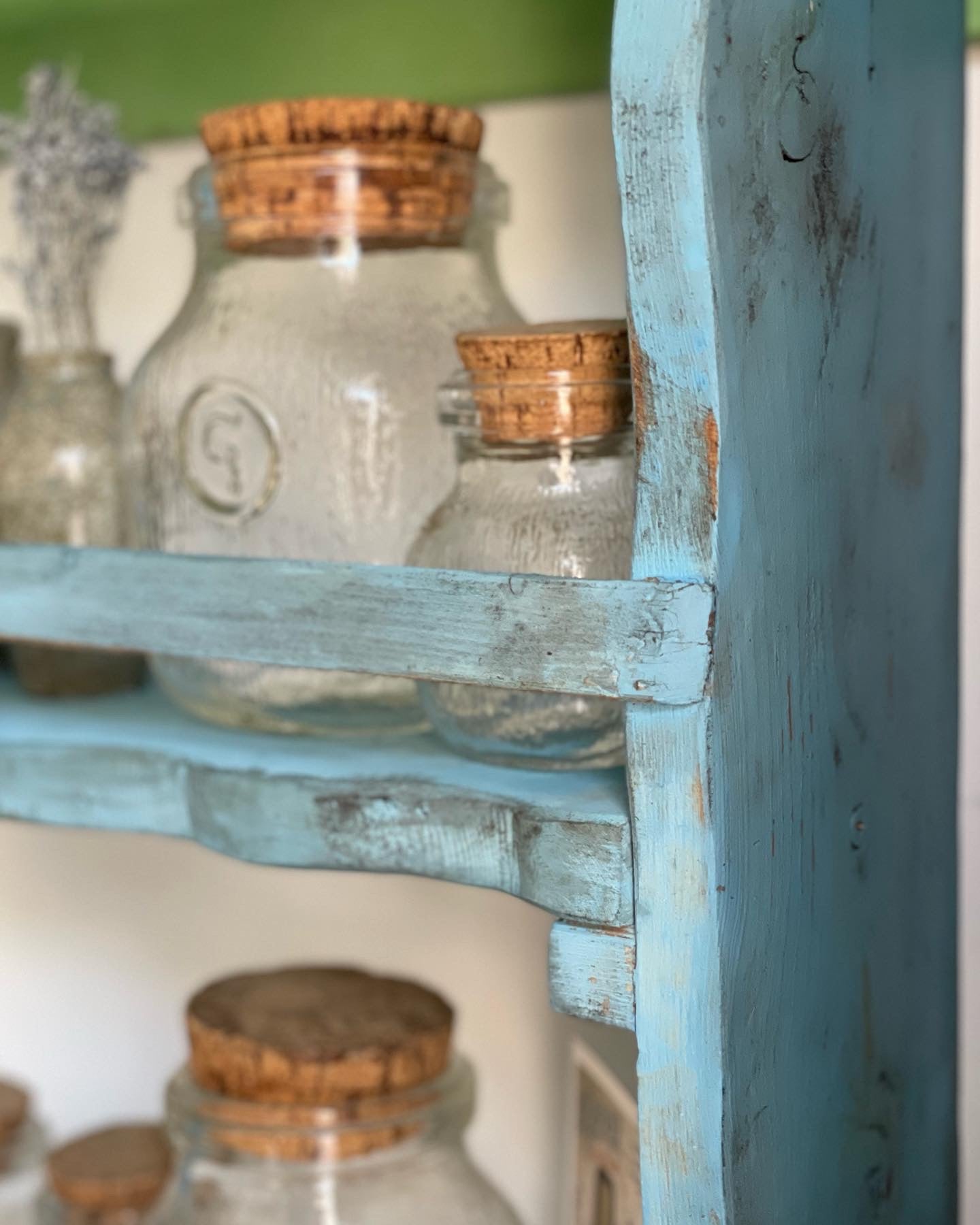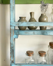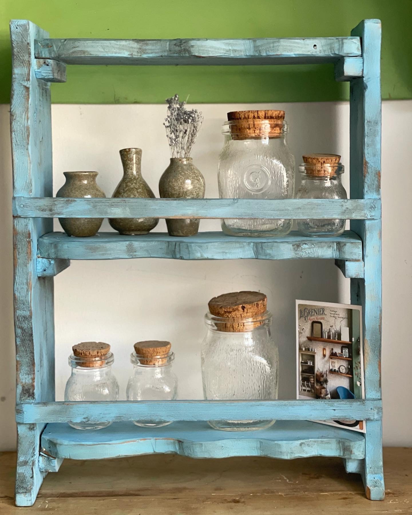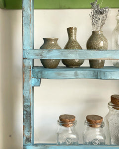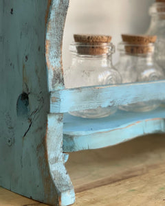 Piccola piattaia/portaspezie artigianale in legno. laccatura azzurra, presenta lievi segni del tempo e di utilizzo. Da appoggio, con possibilità di applicare ganci sul retro per renderlo un pensile
