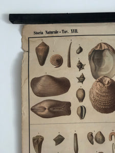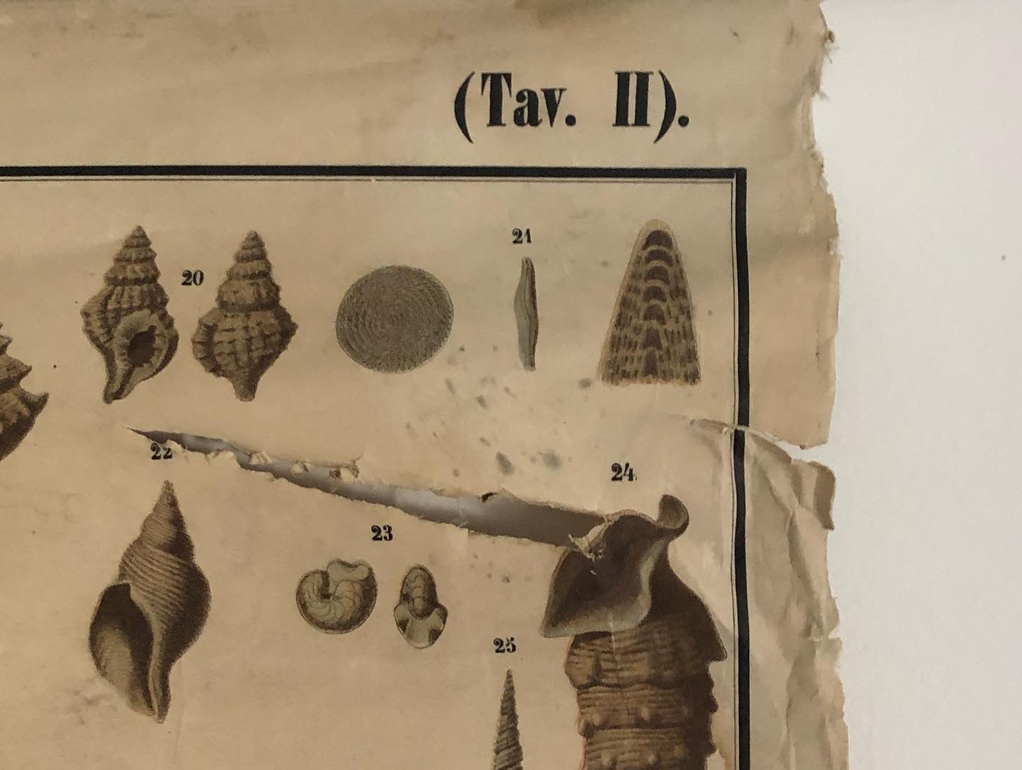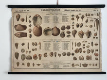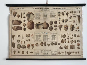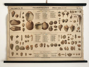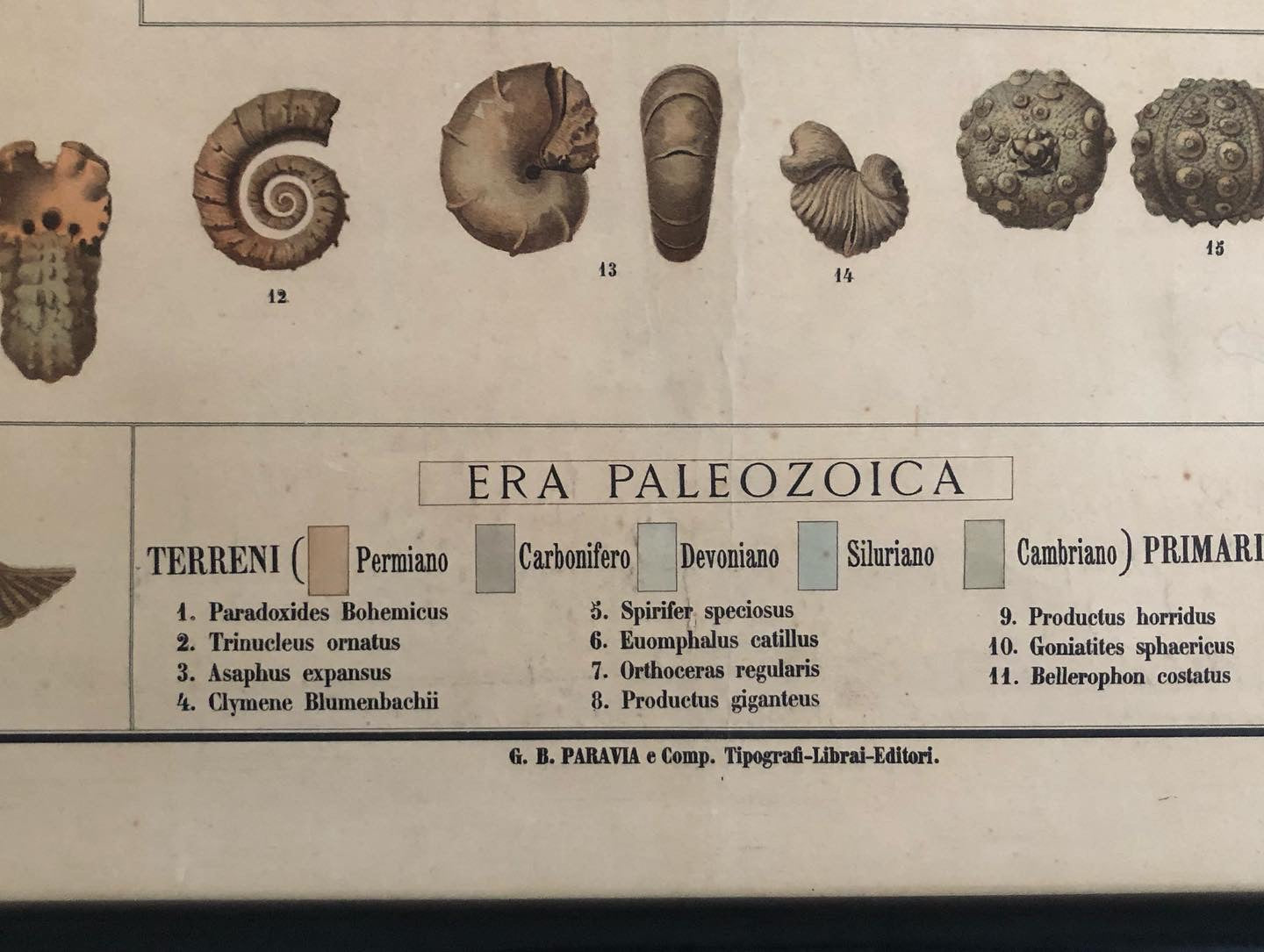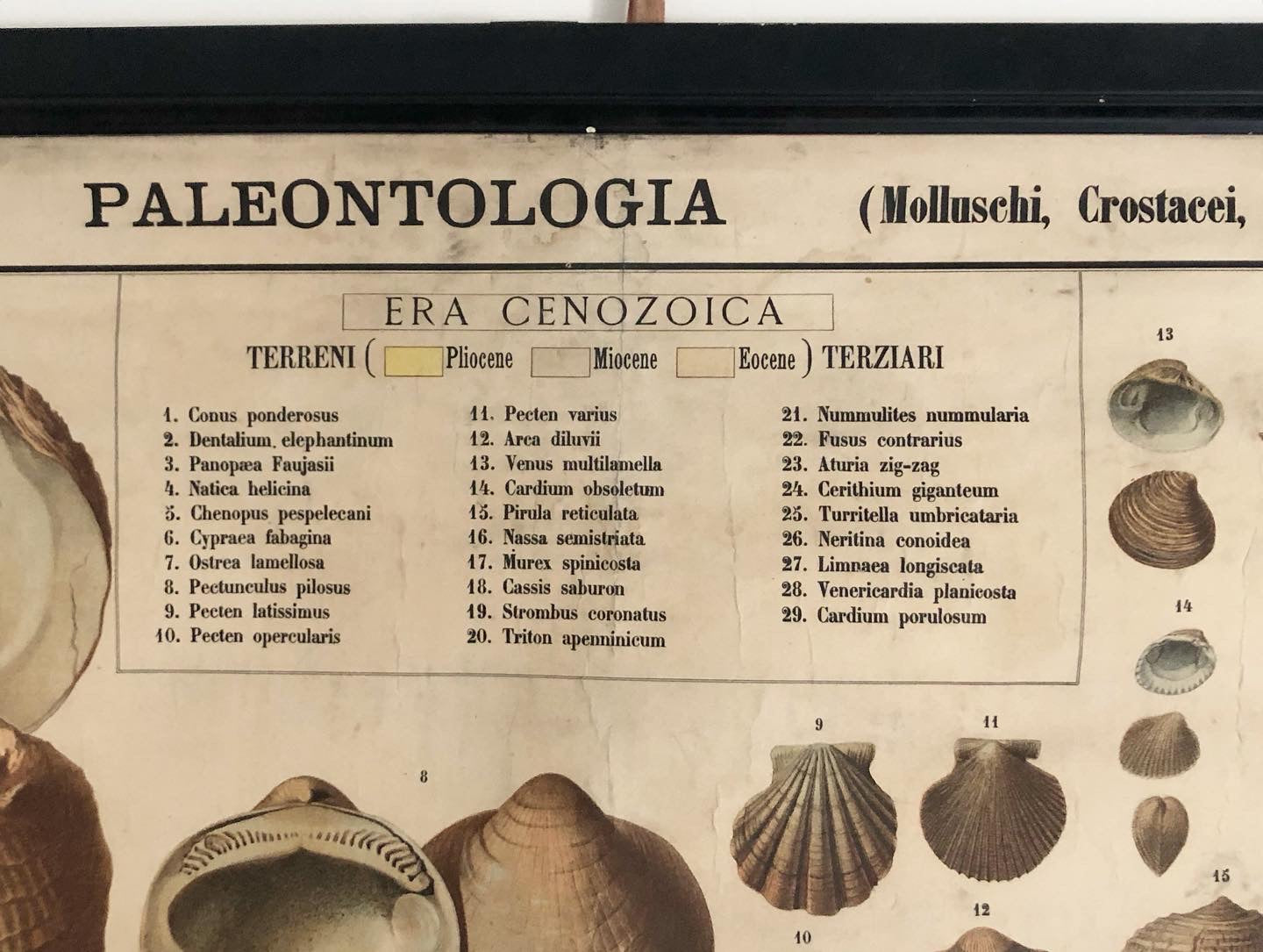 Tavola didattica PALEONTOLOGIA, Paravia, Italia 1950/60 circa. Bacchette in legno, carta su tela. Presenta segni del tempo e di usura, come da foto. misure: L 105xh75 (100x70 cm)