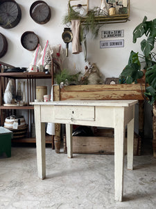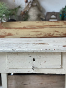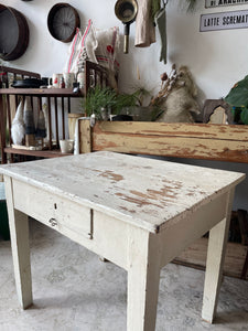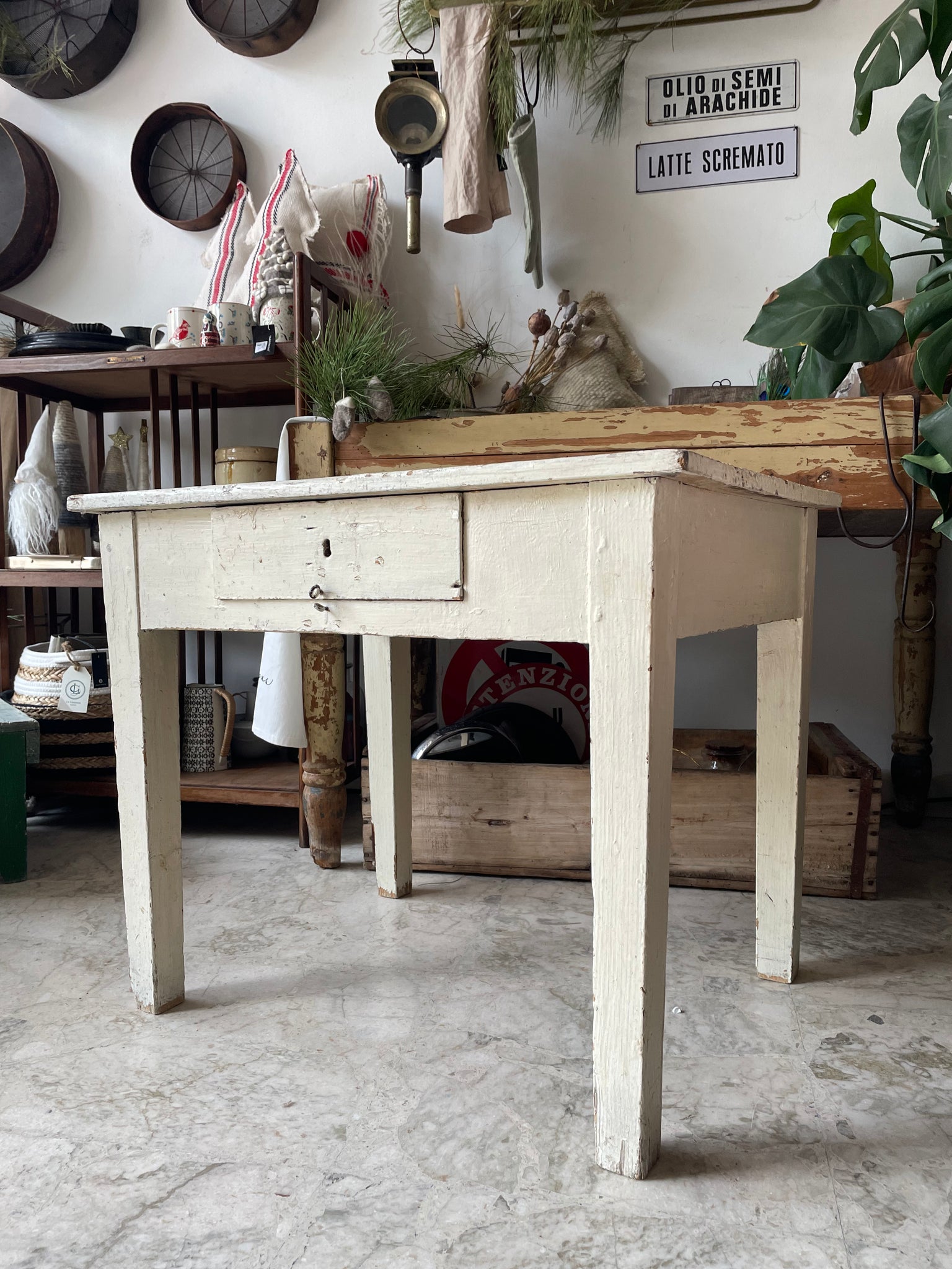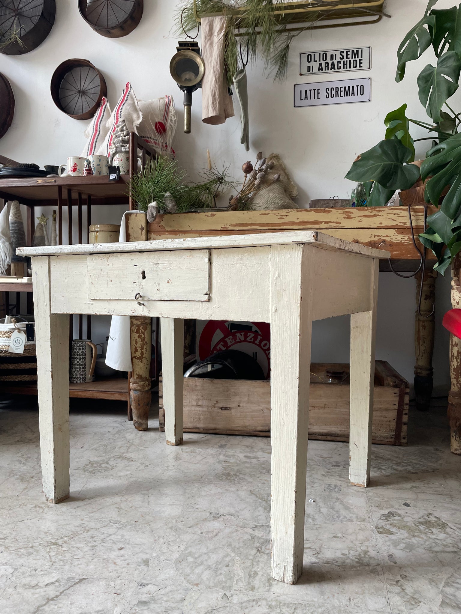 Tavolino basso da salotto (o da bambino) in legno di pino/abete con cassetto centrale. Recuperato in Abruzzo, databile alla prima metà del secolo scorso (1900-1950). Presenta segni del tempo e di utilizzo, come da foto, laccatura originale