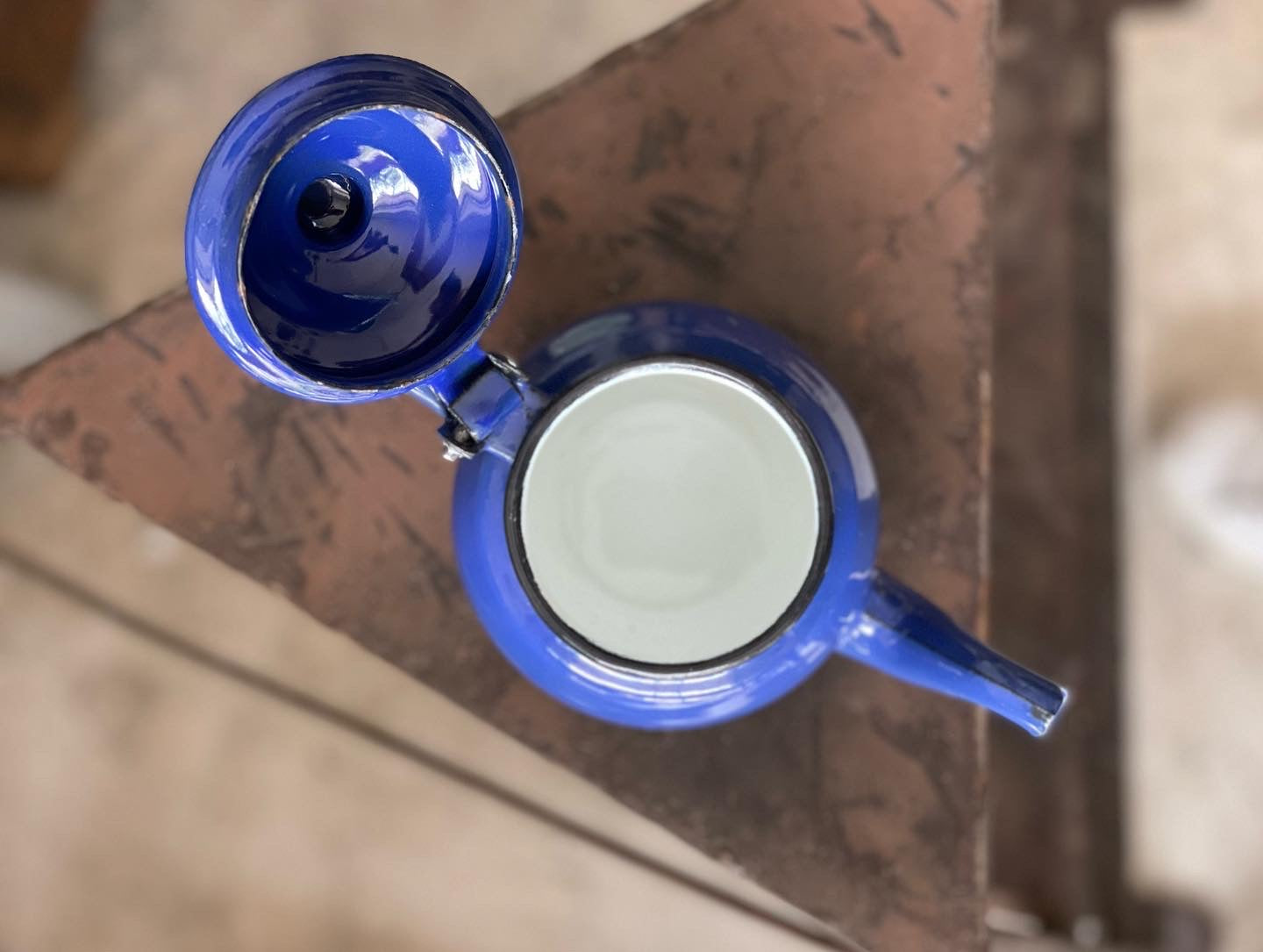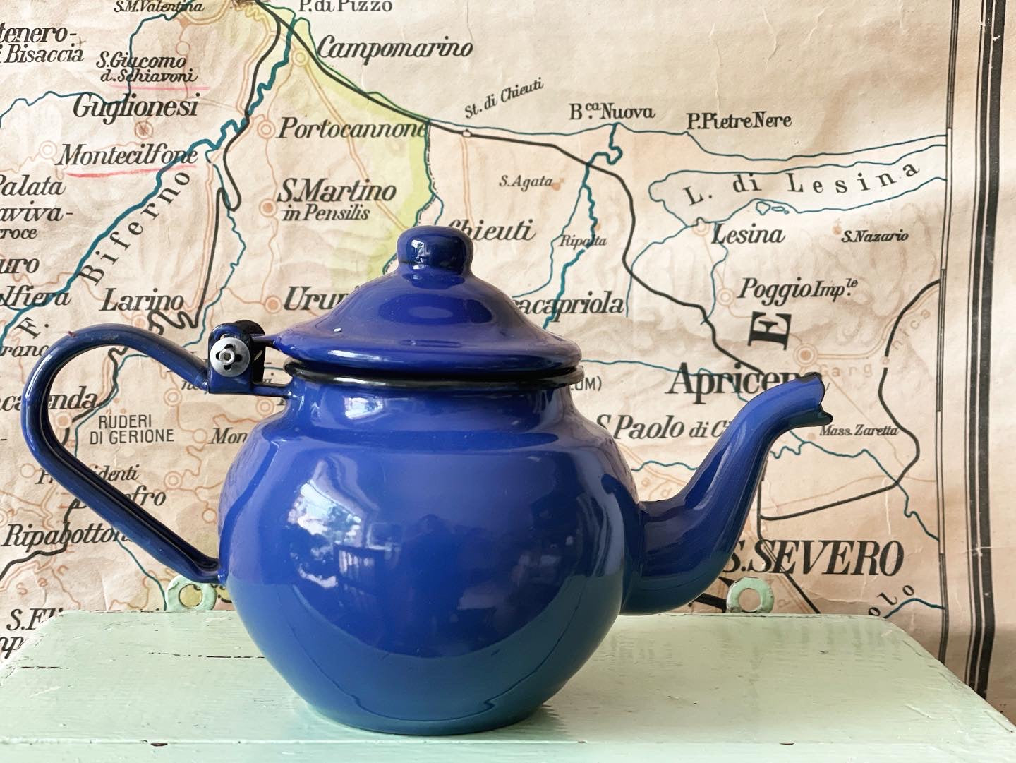Piccola teiera in latta smaltata, senza logo. Recuperata in Abruzzo, seconda metà 1900.