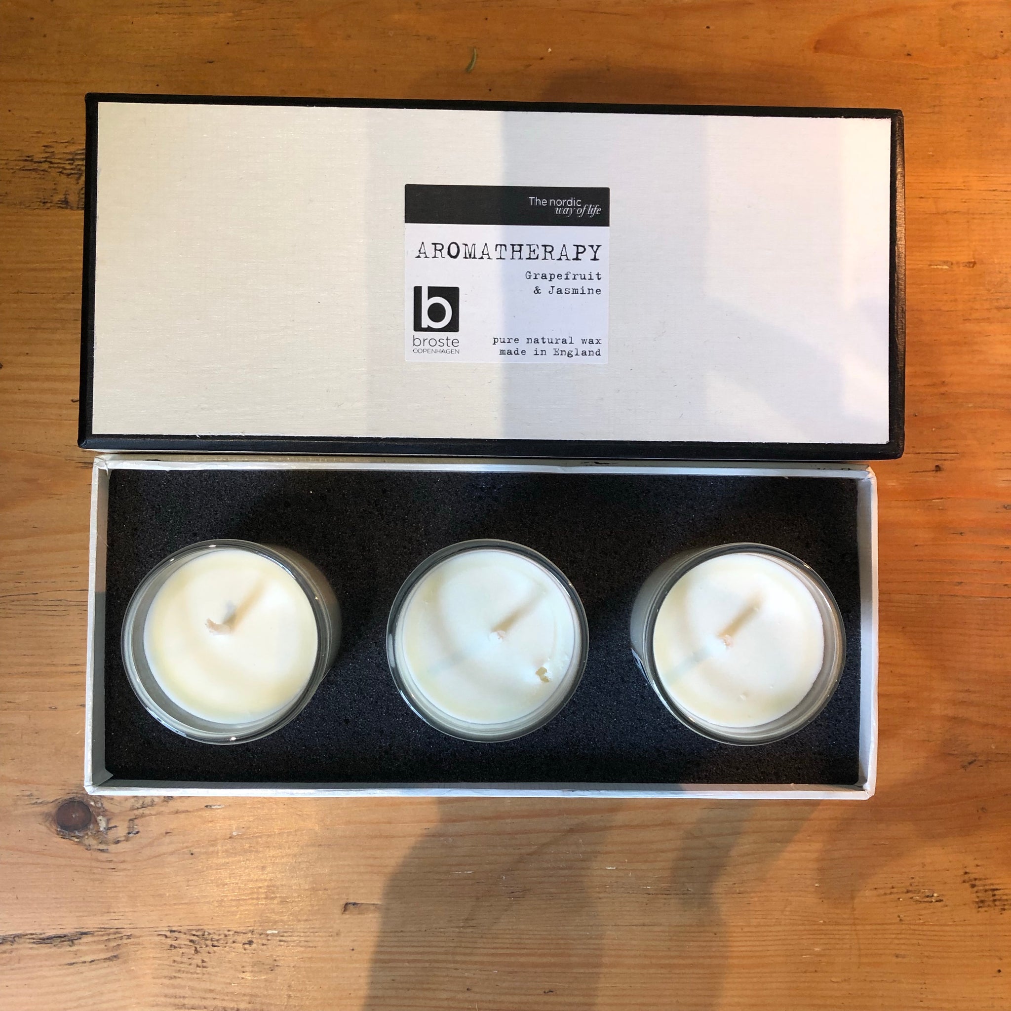 Tris scented candle, Aromatherapy by Broste in glass container, luxury box.