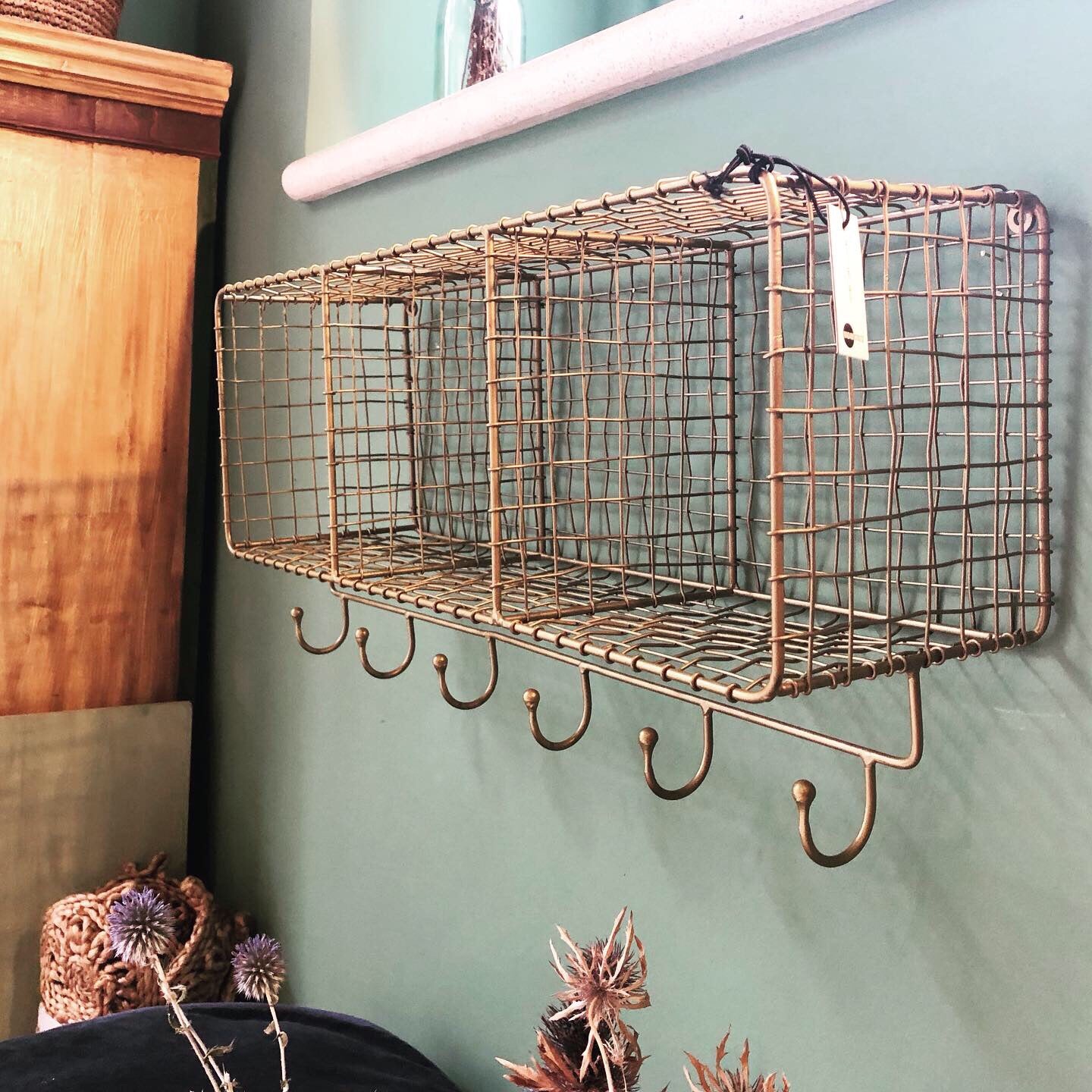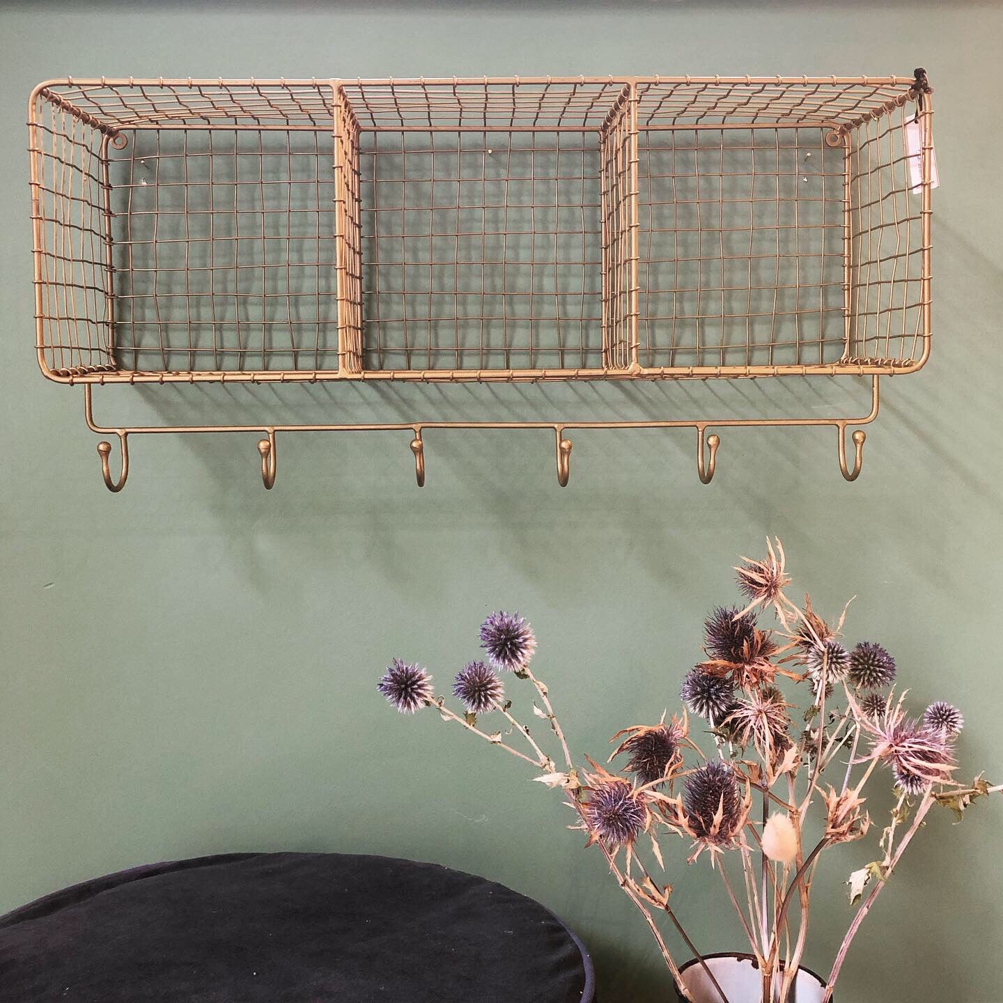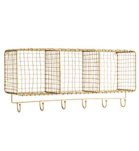 Mensola in filo di metallo, finitura ottone. Tre scomparti e sei ganci.