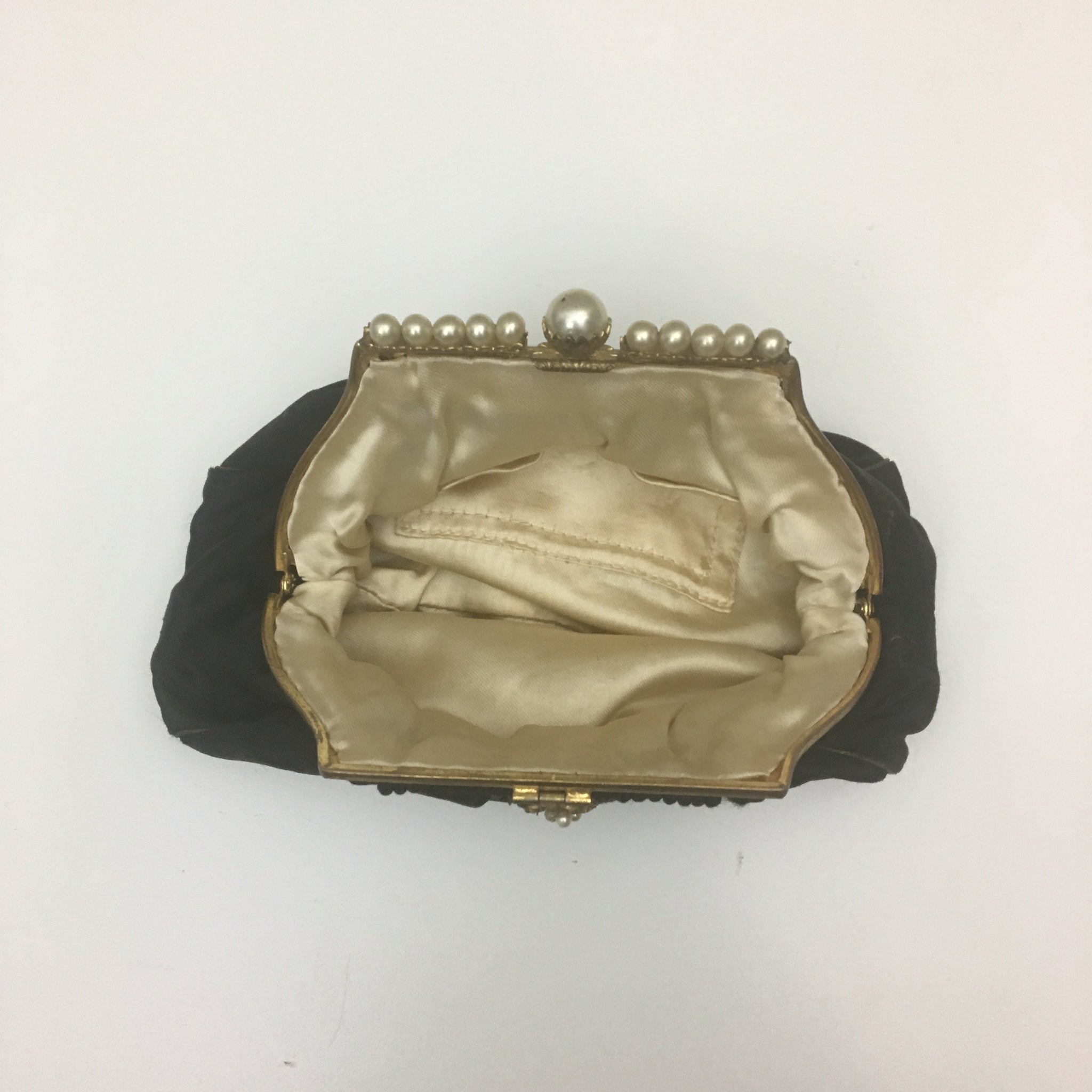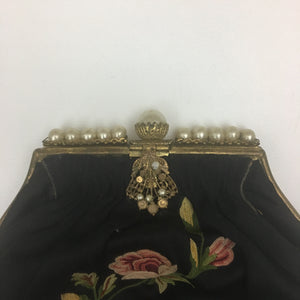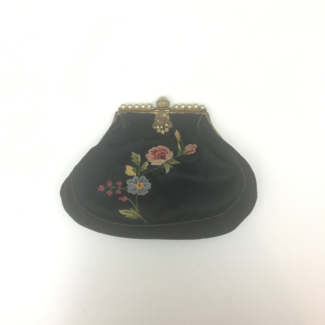 Pochette gioiello a mano, in raso nero, interno raso avorio. Decoro floreale ricamato a mano, chiusura in metallo dorato decorata con perle. Epoca: fine 1800. Presenta qualche leggero segno del tempo che, lungi dal rappresentarne un difetto, è prova della sua autenticità.