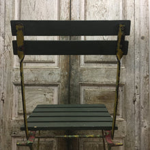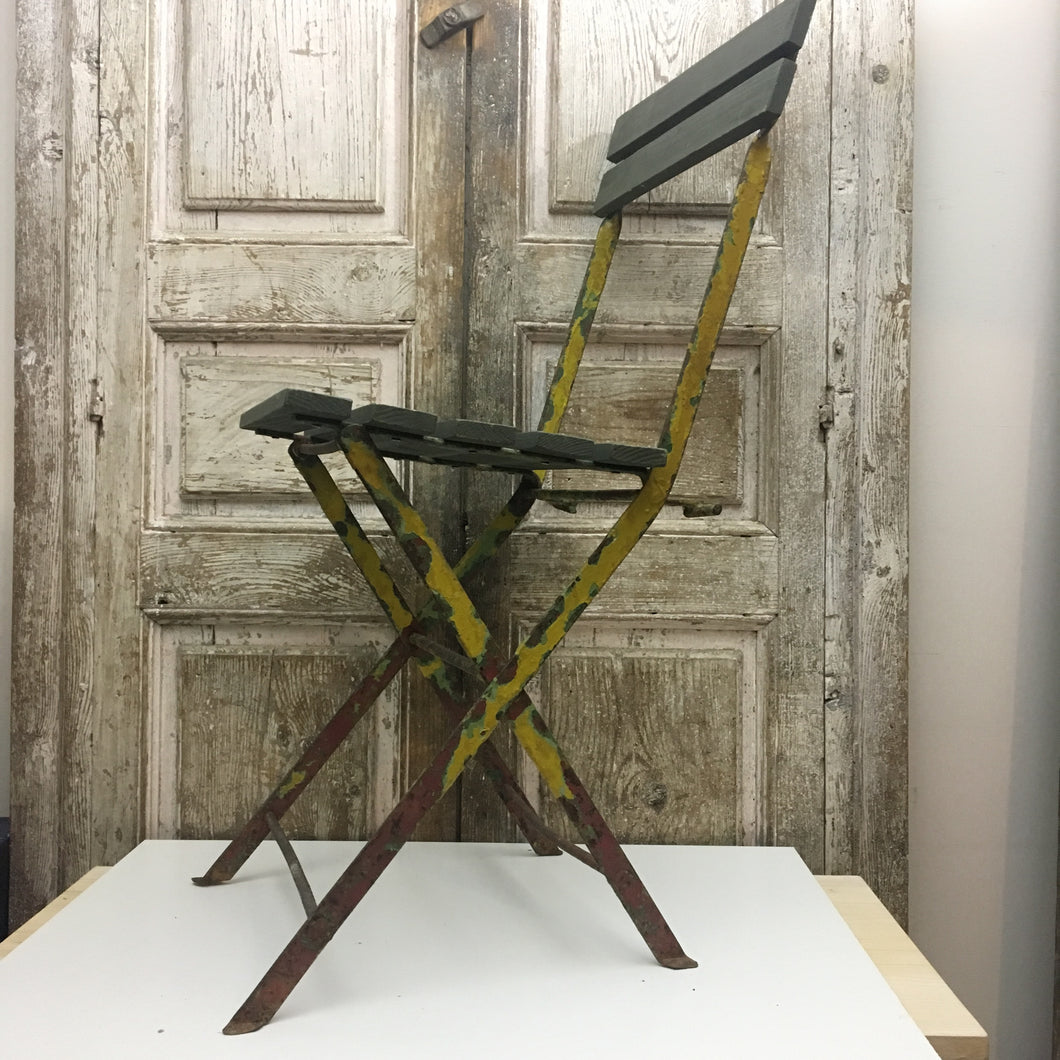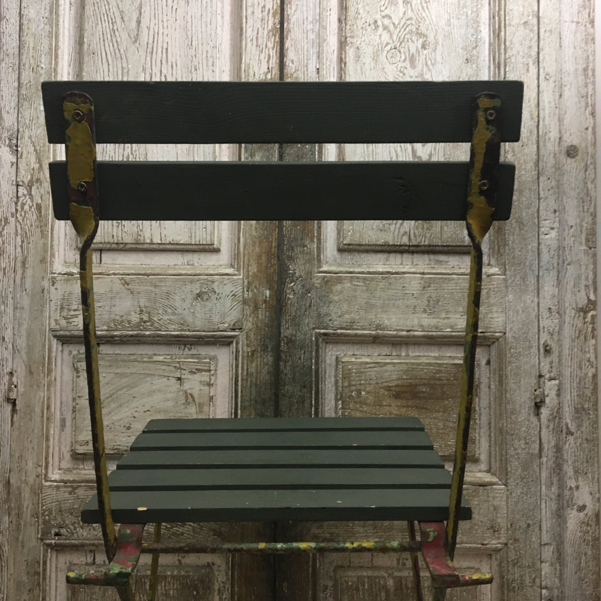 Sedia pieghevole da bistrot francese, anno 1930 circa. Arredo autentico, struttura in ferro vernice multicolore, prevalentemente gialla, seduta e schienale in legno, laccatura verde. Presenta segni del tempo