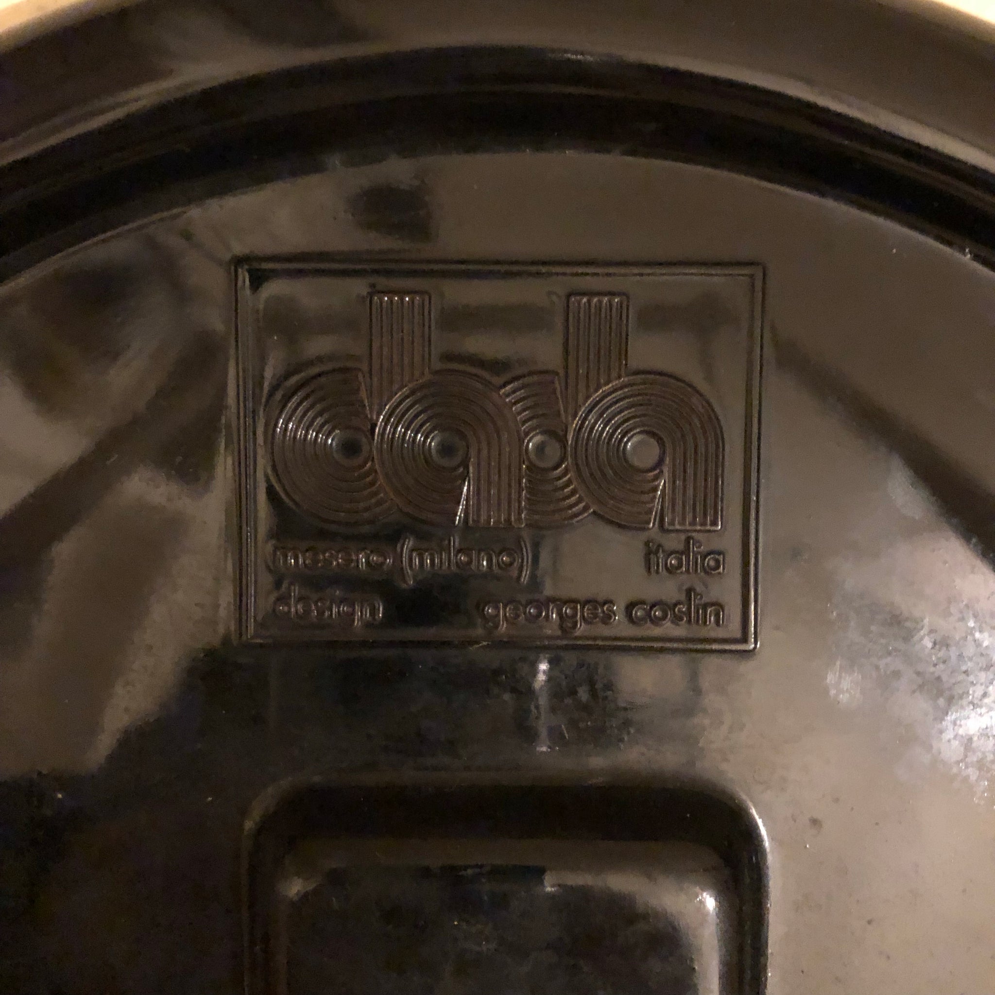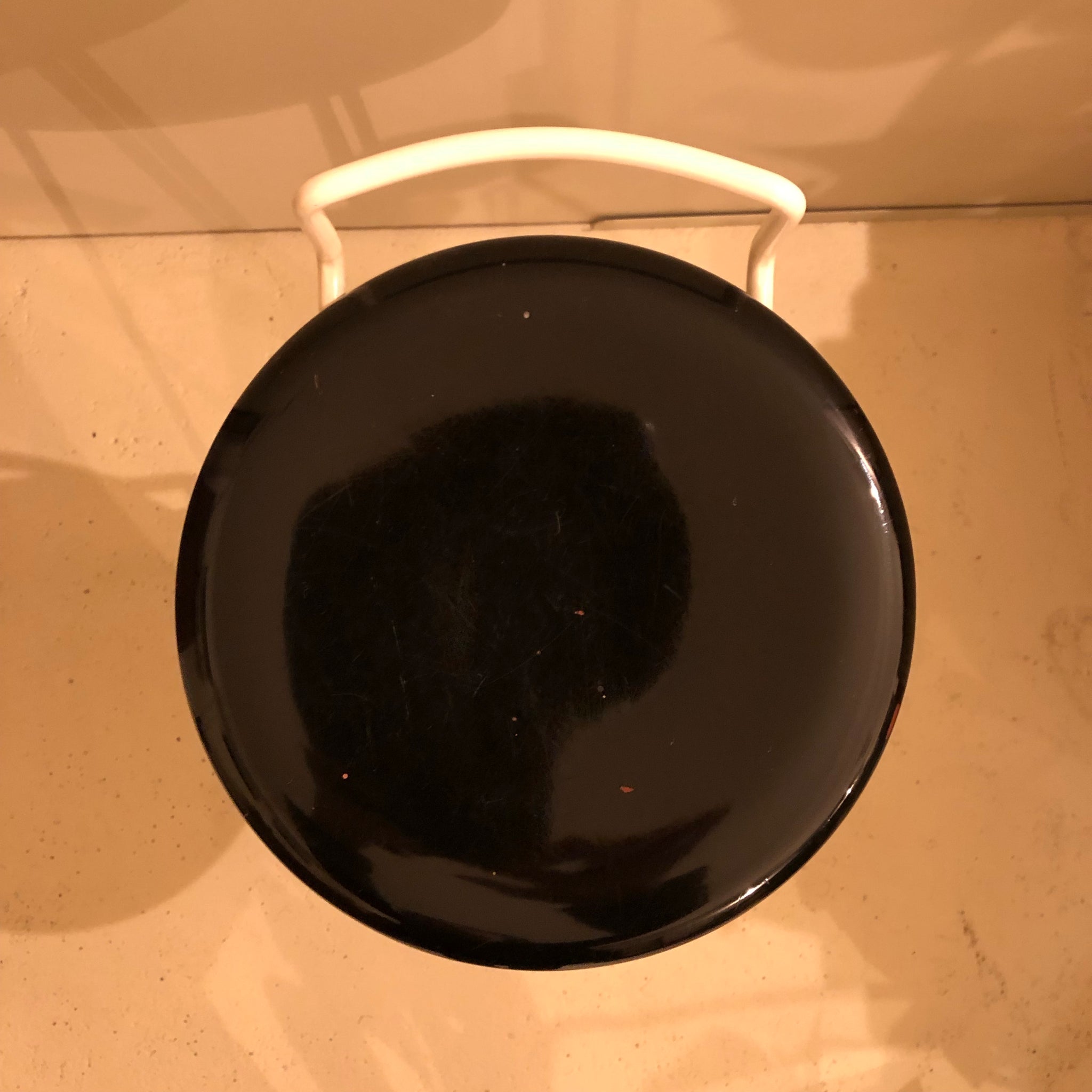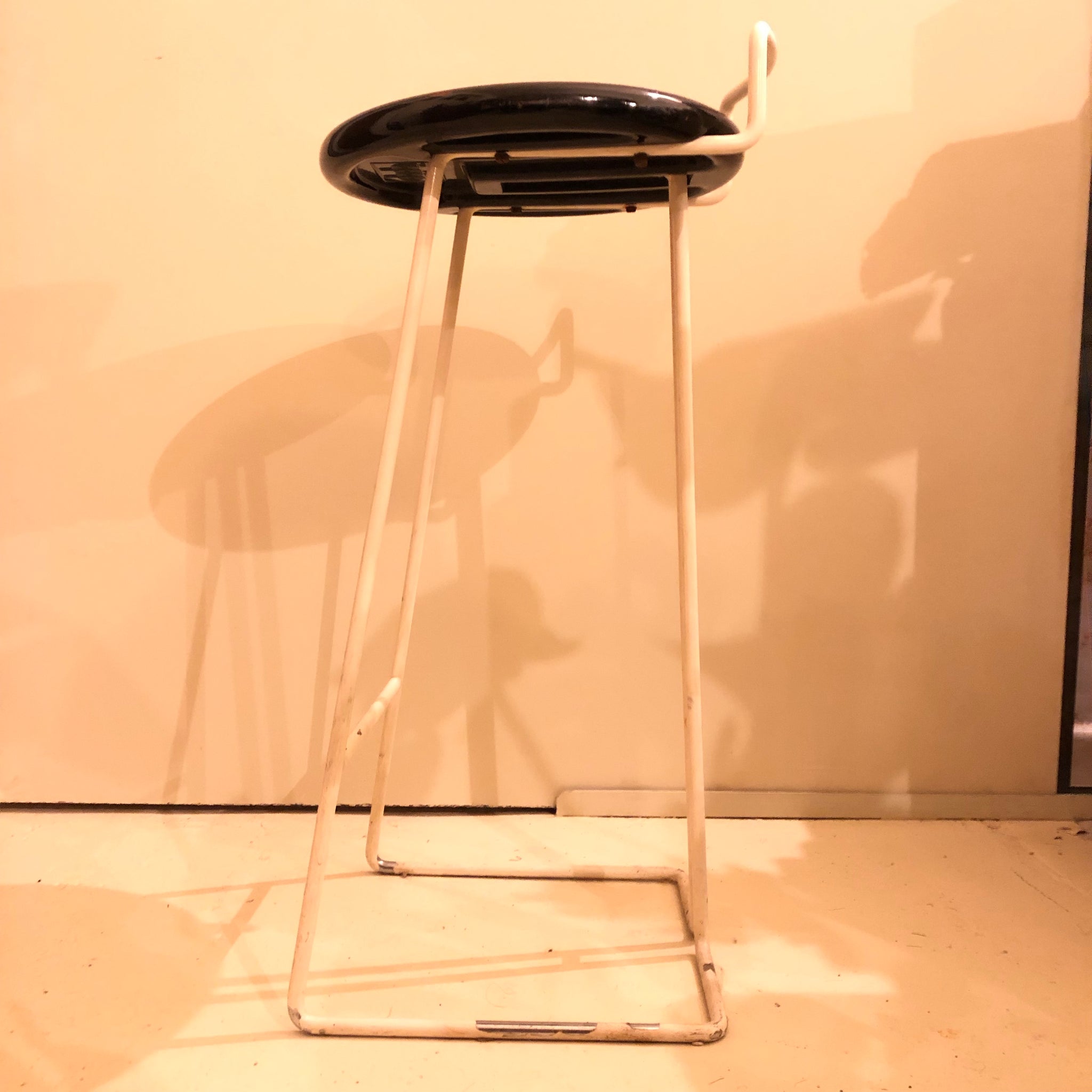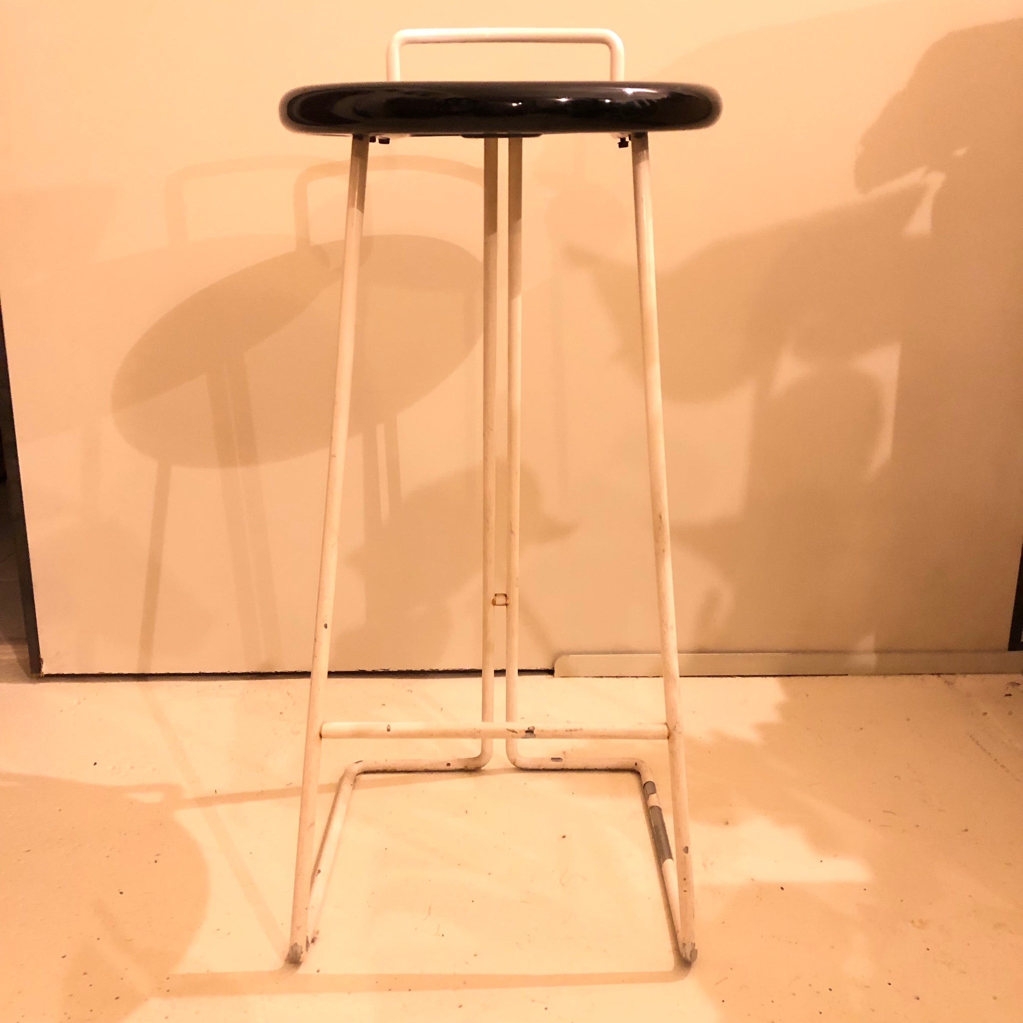 Sgabello vintage anni ‘70. Design George Coslin per Dada design. Acciaio cromato laccato bianco panna, seduta in plastica, nero. Presenta segni del tempo e imperfezioni. Pezzo unico
